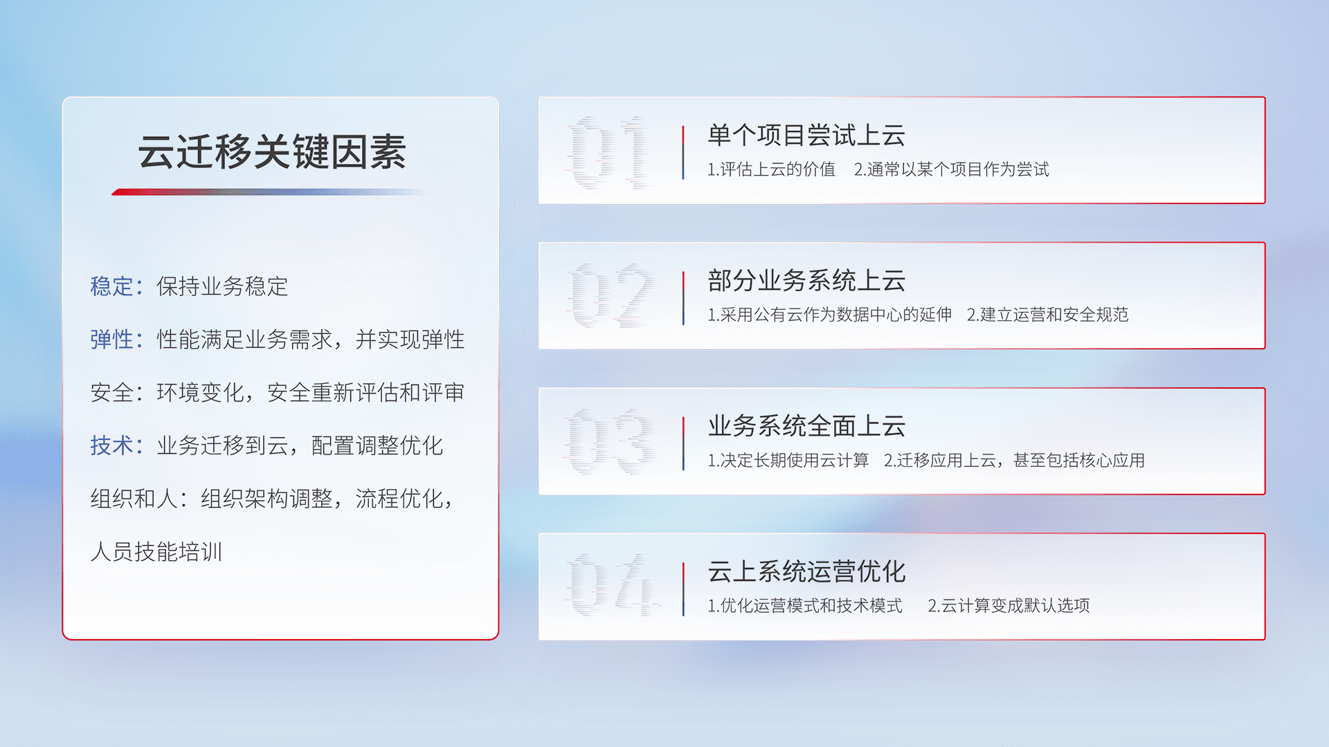 结合实际业务,,从规划设计、、、、云平台选型、、、、云原生改造、、、数据迁移、、、、集成交付,,迁移全过程为客户识别最佳上云路径,,做好风险识别管理,,设计网络架构、、、身份权限、、、安全审计合规、、操作审计、、、日志审计、、监控告警策略、、、、多站点容灾设计等,,对云上基础设施进行整体规划,,提升IT治理水平,,以满足弹性、、、高可用、、高性能的需求。。。。
