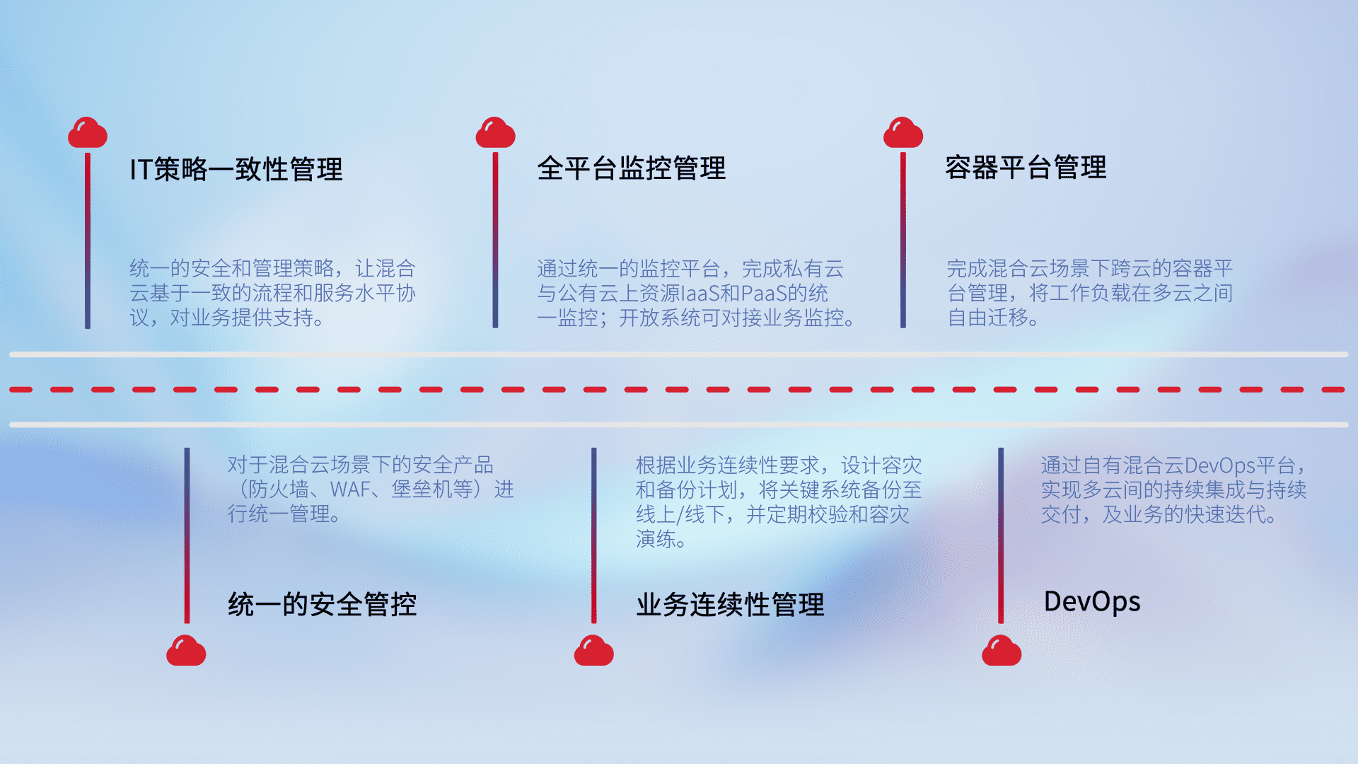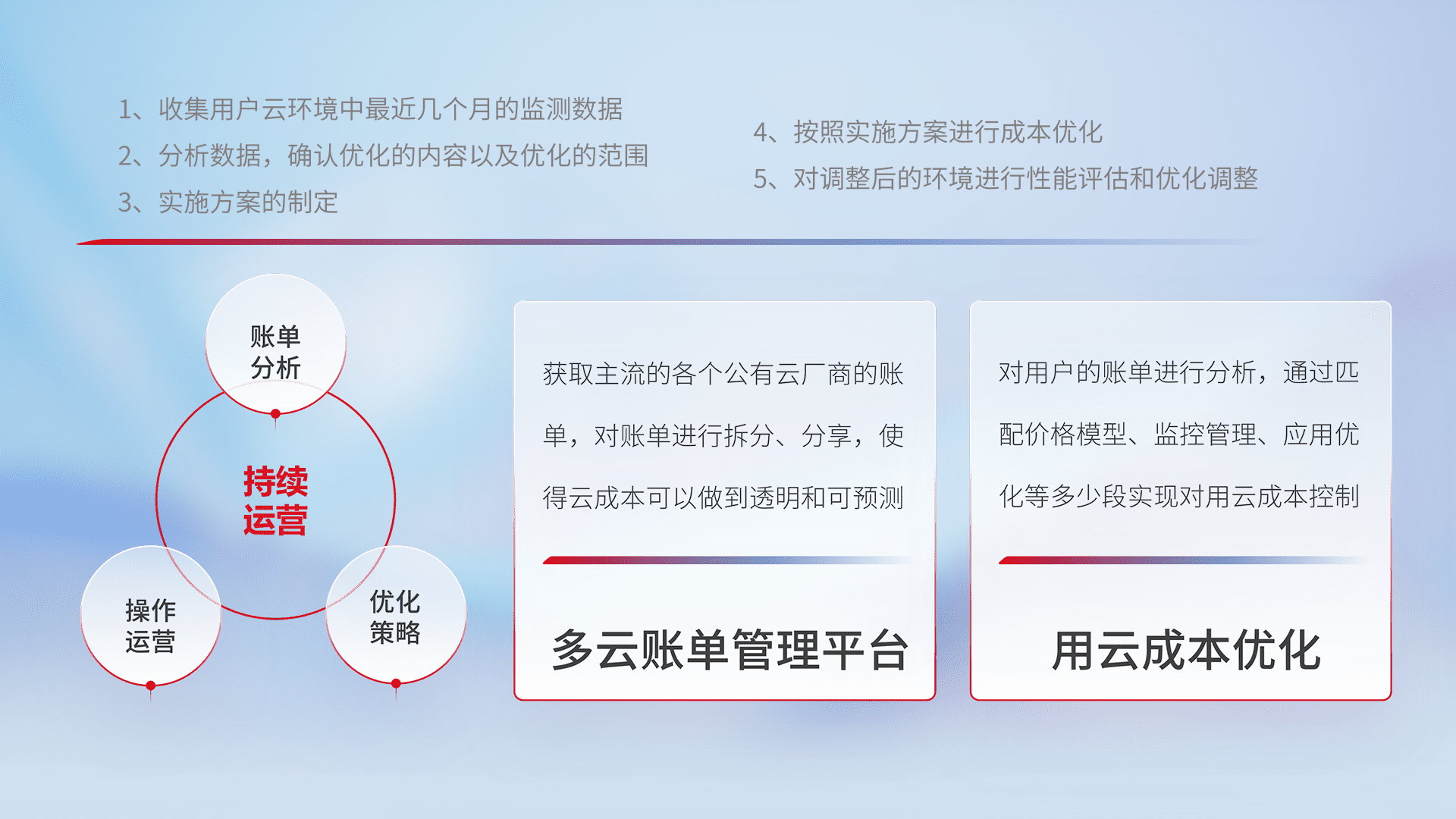 通过多云纳管,,,,以统一的资源数据模型把客户的云资源进行抽象和封装,,,进而实现对多云资源的统一操作,,保障云资源管理的可靠性、、稳定性与可用性。。。量身定制化运维内容,,,,配置、、、开发运维、、补丁管理、、、备份、、监控、、、、认证和访问管理、、、审计和日常巡检等,,,,保障在用云过程中的可靠度,,,,稳定度以及高可用率。。。